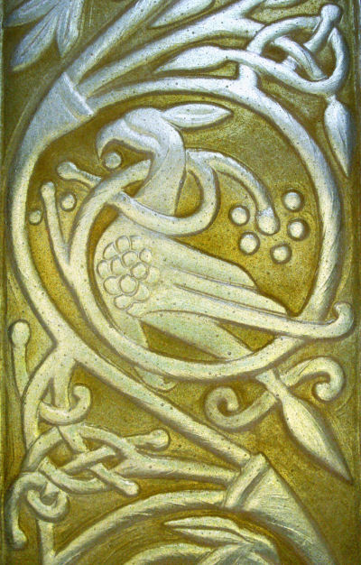 Since Barry made his stone, the base section of the original stone had been uncovered and I was able to see the original carving and figures in this area. I redesigned the side borders to work with this section.