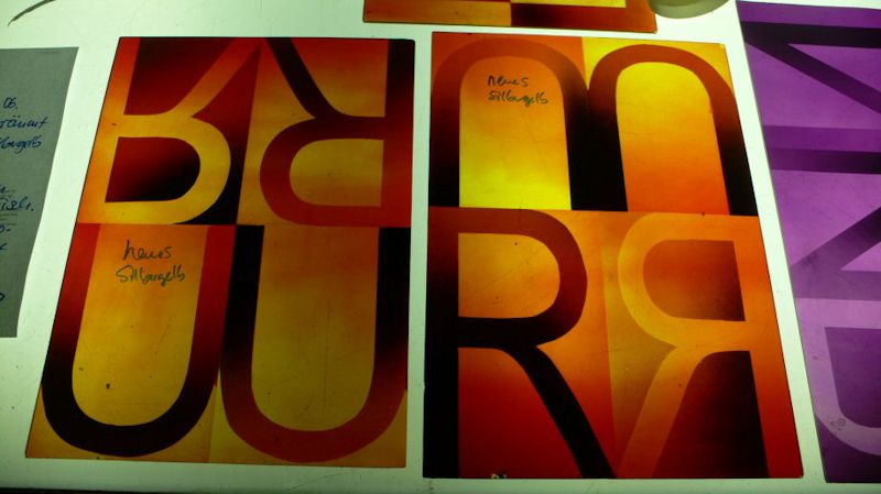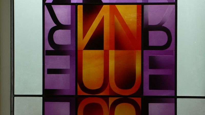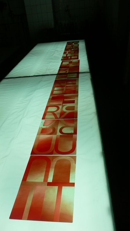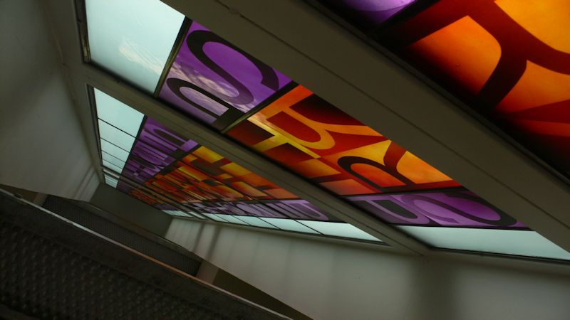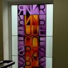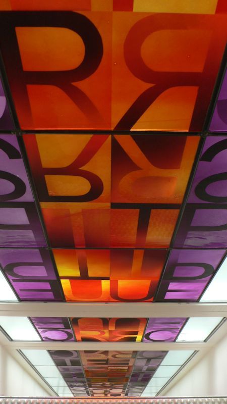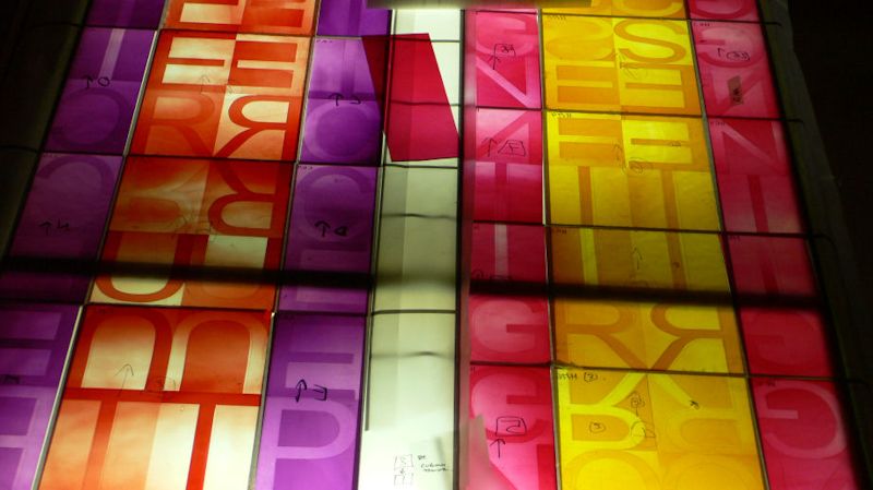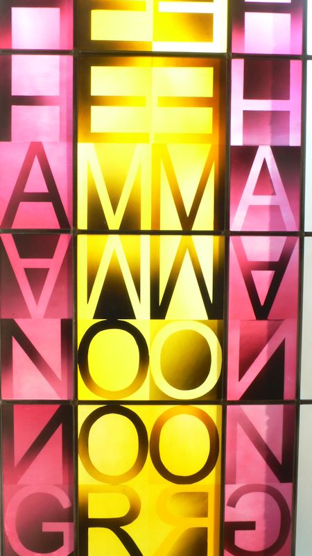 The idea is based on the architecture and the function of the building. It relates to the function of the building. It uses the decorative and abstract qualities of text to creates two large shimmering objects.
