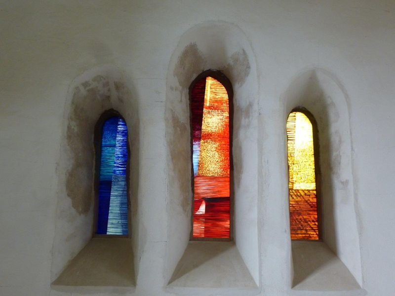 Three small windows for a church in former Eastern Germany. The building was almost a ruin when I first visited it, but the architect, Herr Friedrich, had a vision to make and install the windows creating a small completed area of beauty that the restoration could be built around.