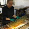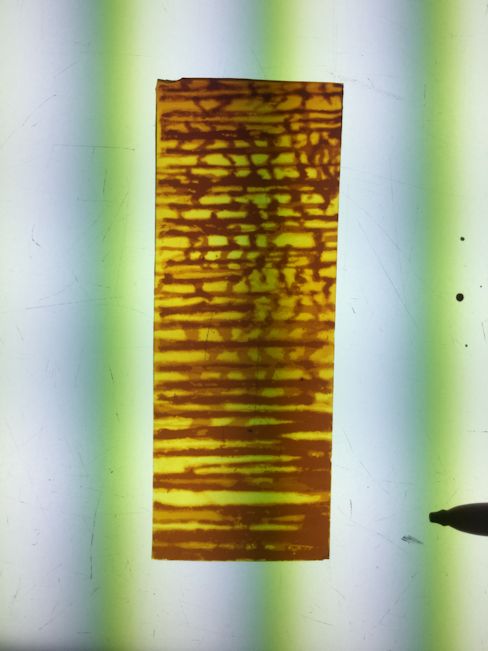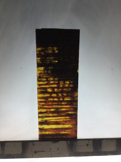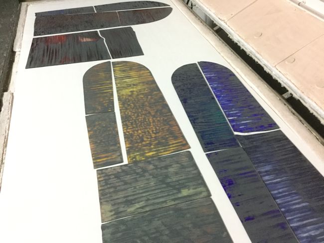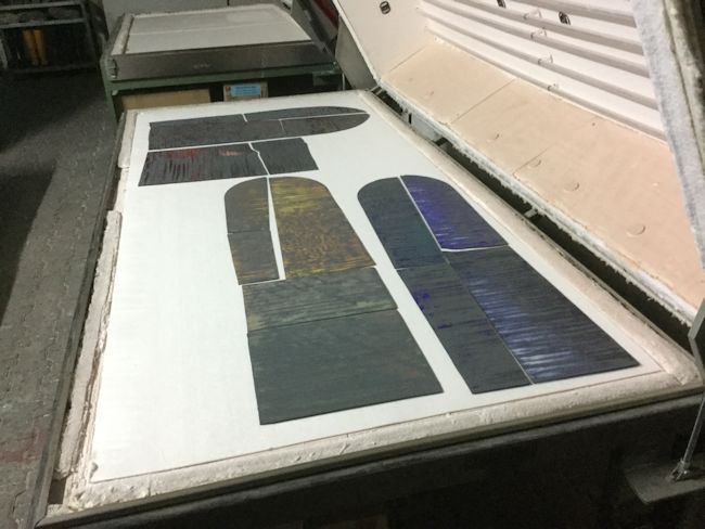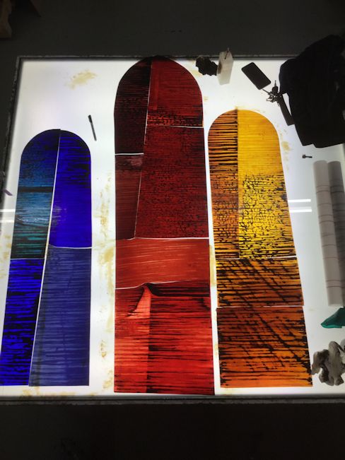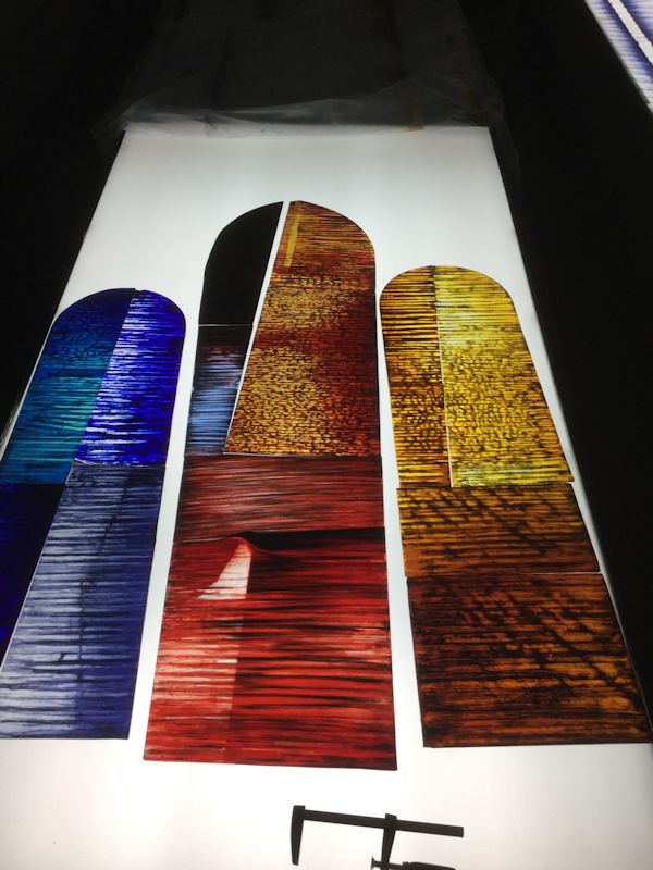 The most important technique employed here is acid etching. The mouth blown, lamberts flashed glass, is protected on the back and repeatedly etched on the flashed side. This technique alone can be very beautiful, but I wanted to add another layer of quality. This was done using glass painting. Just as I developed etching techniques for this kind of work, I developed a method of glasspainting that is also subtle and very appropriate.