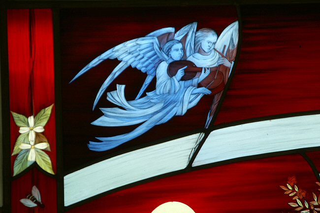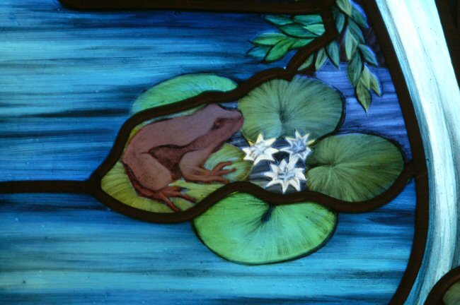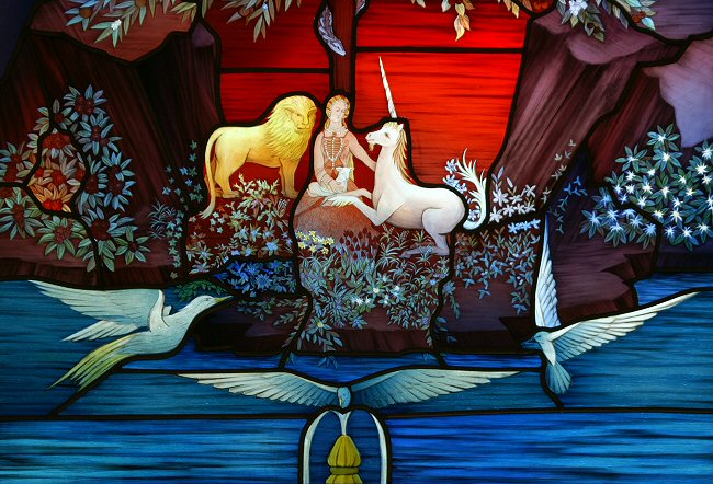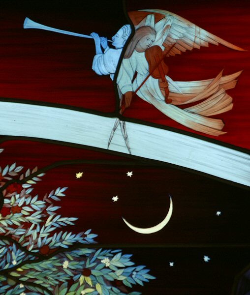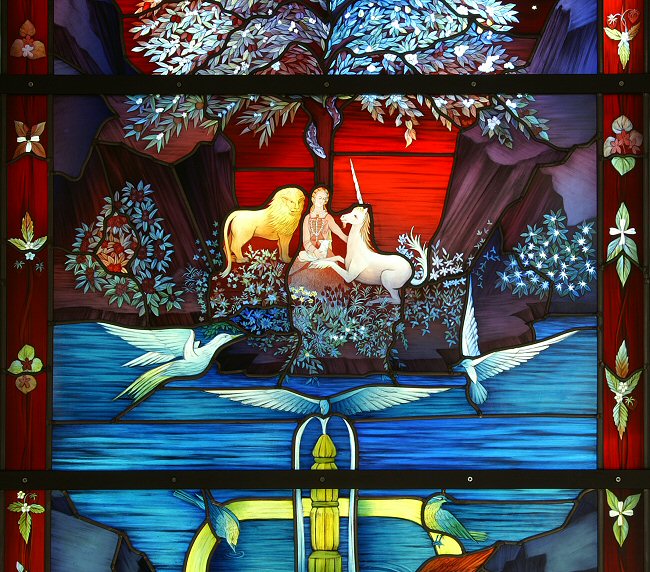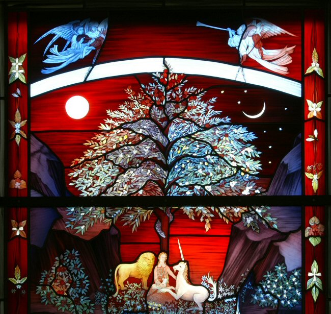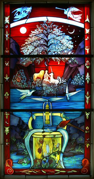 Unicorn A lunar, feminine symbol, with the lion as the male; chastity , purity, virginity, perfect good, virtue, and strength of mind and body; incorruptibility. Unicorns are sometimes depicted on either side of the tree of Life as guardians. The conflict between the lion and the unicorn represents solar and lunar powers and the pairs of opposites. Lion As a solar symbol it represents; masculinity, the heat of the sun, the splendour and power of the noon sun. The fire principle, majesty and strength. They can also be seen as guardians of the Tree of Life and represent vigilance and courage. The symbolic representation of the lion and the unicorn are also underpinned by the presence of the sun and the moon. Lamb, Gentleness, young innocence, meekness, purity, the unblemished. The lamb with the lion depicts the paradisal state. The Serpent When associated with the Tree of Life, its aspect is beneficent. Angels Messengers of God, a link between heaven and this world. The word comes from Angelos which means messenger. Symbols include: flaming swords, trumpets, sceptres, musical instruments, lilies. The Firmament The firmament divides the upper or celestial from the lower or terrestrial waters. The Hebrew word means something beaten or hammered out, it could also be imagined as a great vault of crystal to which the fixed stars were attached. The Fountain representing a source of the water of life that gushes freely forth nourishing the earth. Symbol of waters of life, immortality and eternal youth The Tree The tree of life and the tree of knowledge grow in Paradise. , the tree of life is at the centre and signifies regeneration, the return to the primordial state of perfection. the tree of life, which bare twelve [manner of] fruits, [and] yielded her fruit every month: and the leaves of the tree [were] for the healing of the nations. Rev 22:2 The Birds Linking Paradise with our world. Birds can represent the human desire to escape from gravity and the laws of this physical world, to reach the level of the angel. Border Violets, dogwood and strawberries, at the base water-plants and fish. The symbol of the bee was important to the commissioner and several are included. Other Symbols Wheat and Grapes are traditional Medieval symbols. Fish and a frog on the lily pad, a robin and a kingfisher. Lily of the valley, strawberries and violets. The two Dragons at the base are representations from the staircase feature within the house. Flowers and Blossom both symbols of young life and may represent spring and the fragile nature of childhood. The flower is often a symbol of beauty and the colour adds to the symbolic meaning, red is love and passion, white is innocence. Technique