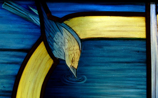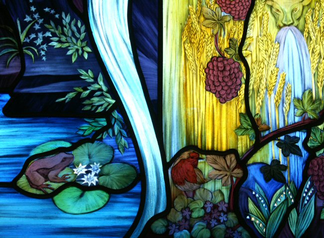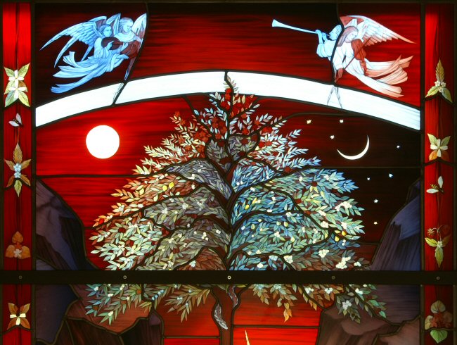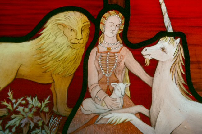 This seemed an appropriate theme and I began with this as the main subject for the window. Several of the motifs and qualities that interested me in the tapestry have been used in the window.