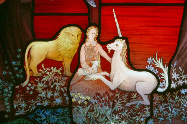 I decided to set this scene in Paradise which in the Middle Ages was assumed to be an unreachable or undiscovered part of the earth. Paradise was typically imagined as an enclosed space or an island. The theme of the Woman and the Unicorn is very old and implies a state and time of innocence. The main group is the Woman and the Unicorn, She has a Lamb in her lap and behind her shoulder is a Lion. They sit beneath the Tree of Life from which descends a Serpent. The tree contains the many fruits and blossoms as described in Revelation, and the group sits on a bed of flowers. (see the symbols list below) As I worked on the designs, the group of figures got pushed further back into the composition and I formed three distinct areas within the space: Heaven, Paradise and Earth. At the top of the window therefore is Heaven where on both sides Angels playing musical instruments swoop into the scene. These I drew from medieval illuminated manuscripts. The area of Heaven is separated from Paradise by the firmament. The Tree of life reaches from Paradise and has a tentative contact to the area of Heaven. The theme of separation of Paradise from Earth is achieved by the other main theme of the window, water. For the foreground I found another symbol that I have frequently used in some form, the fountain. I also found a link with the story of the Unicorn so it seemed doubly relevant here. As can be seen from this illustration, I have adapted and used several of the symbols from this illustration Taken from this source The shape and form of the fountain The pheasant drinking The other birds The water pouring from the mouth of the decorative lion The Unicorn Is Found (detail), ca. 1495-1505 Southern Netherlands The Metropolitan Museum of Art, New York.