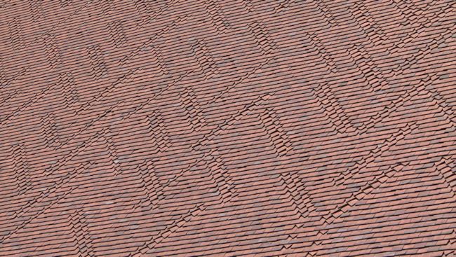 The roof for the cathedral has this outer layer of terra-cotta tiles from Kenya Clay. It was felt that the tiles should not be left simply in this natural state, so we created a design based on cutting the tiles.