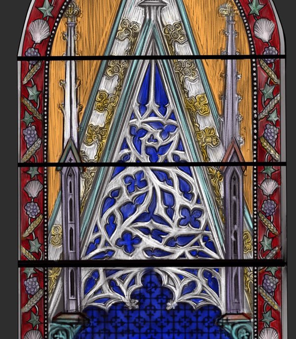 For the columns supporting the canopy, I have borrowed a decorative feature from the supporting columns in the Saint Thadeus Window.