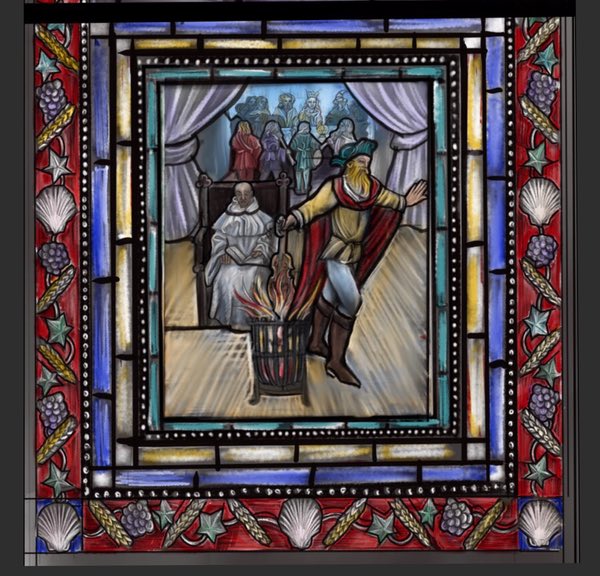 Each lancet contains a major figure and a scenic panel. In keeping with the composition of the other windows in the Baptistry, I felt that it would be inappropriate to show a scene or event in the area of the major figure. It seemed more in keeping with the building to represent the figure with a recognizable gesture or attribute. The small panel allows a further exploration of the subject of the window. Due to the nature of the figures represented, it would seem to be inappropriate to ornament the robes.