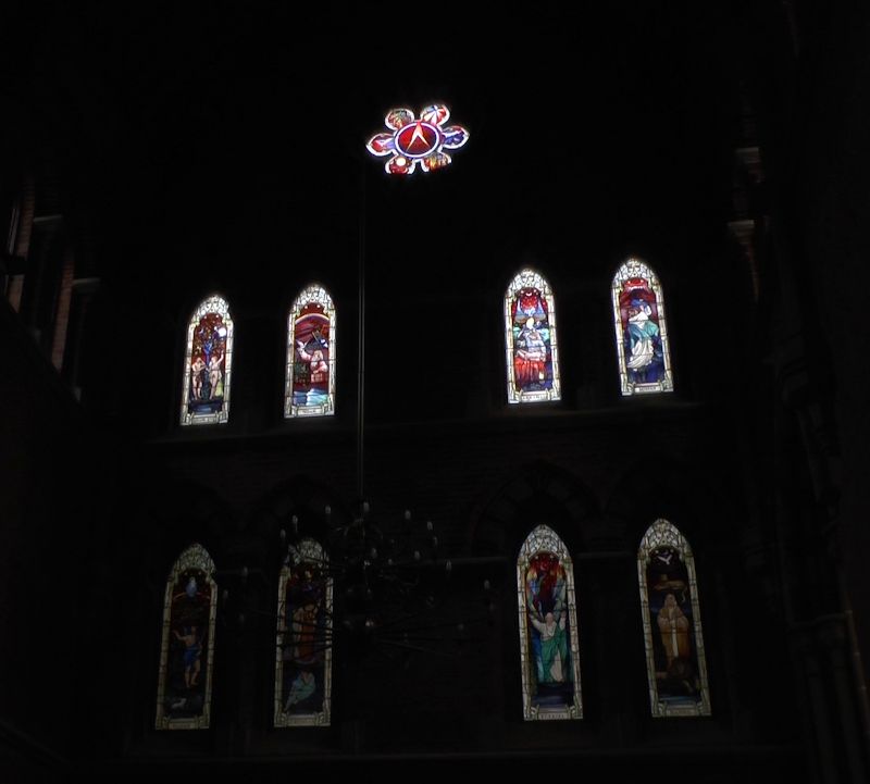 the upper row of four windows contain the figures of St. Mary, St. Peter, St. Paul and St. Stephen.