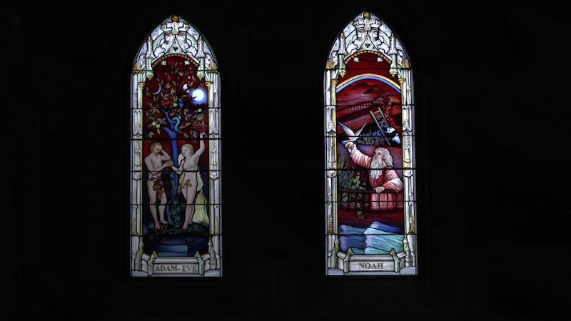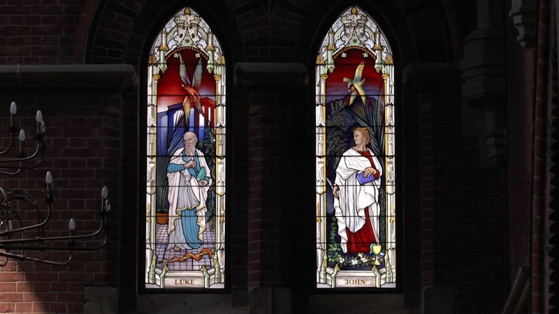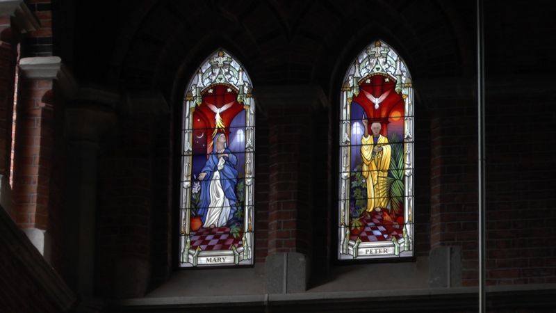in some way they can be read as two pairs of windows. The Mary and Peter window sharing an architectural space, the Cenacle in Jerusalem where, by tradition, the events of the last supper and Pentecost and other events surrounding the beginnings of Christianity reputedly took place.
