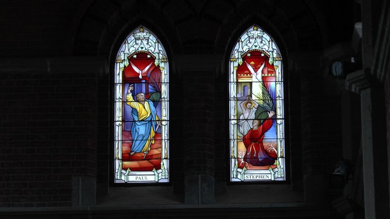 The St Paul and St Stephen windows are also in some way linked. Paul, as Saul, was an instigator and was possibly present at the Martyrdom of St Stephen.