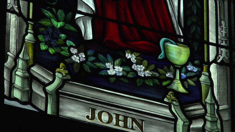 At the base of the St. John window, there is a snake emerging from a goblet, an allusion to the miracle of St. John drinking poisoned wine.