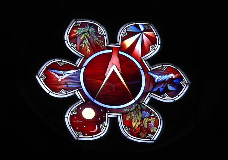 The theme of the Rose window is the Holy Spirit surrounded by 7 lamps representing the 7 gifts of the Holy Spirit. I have tried to find some way of developing the idea further symbolically, but apart from creating different representations of light within some of the petals of the rose, the design seems complete to me.