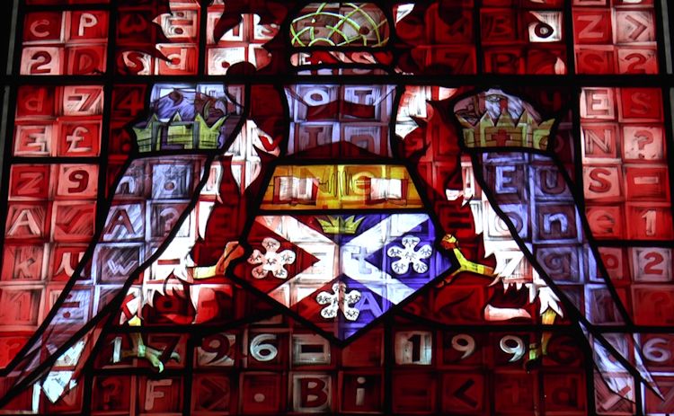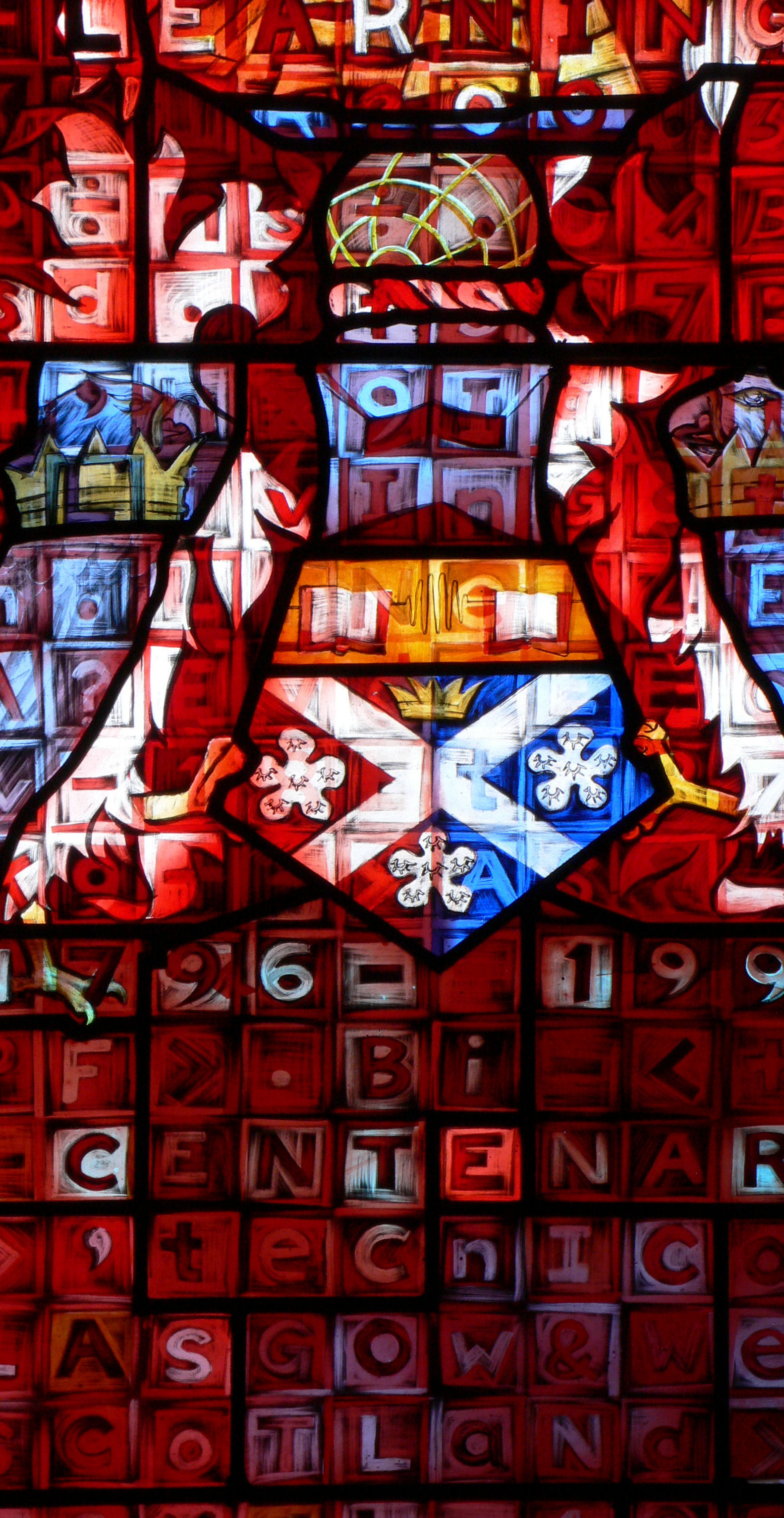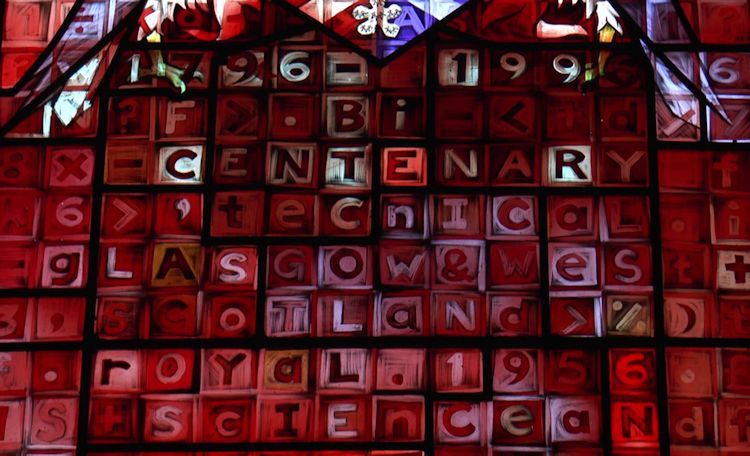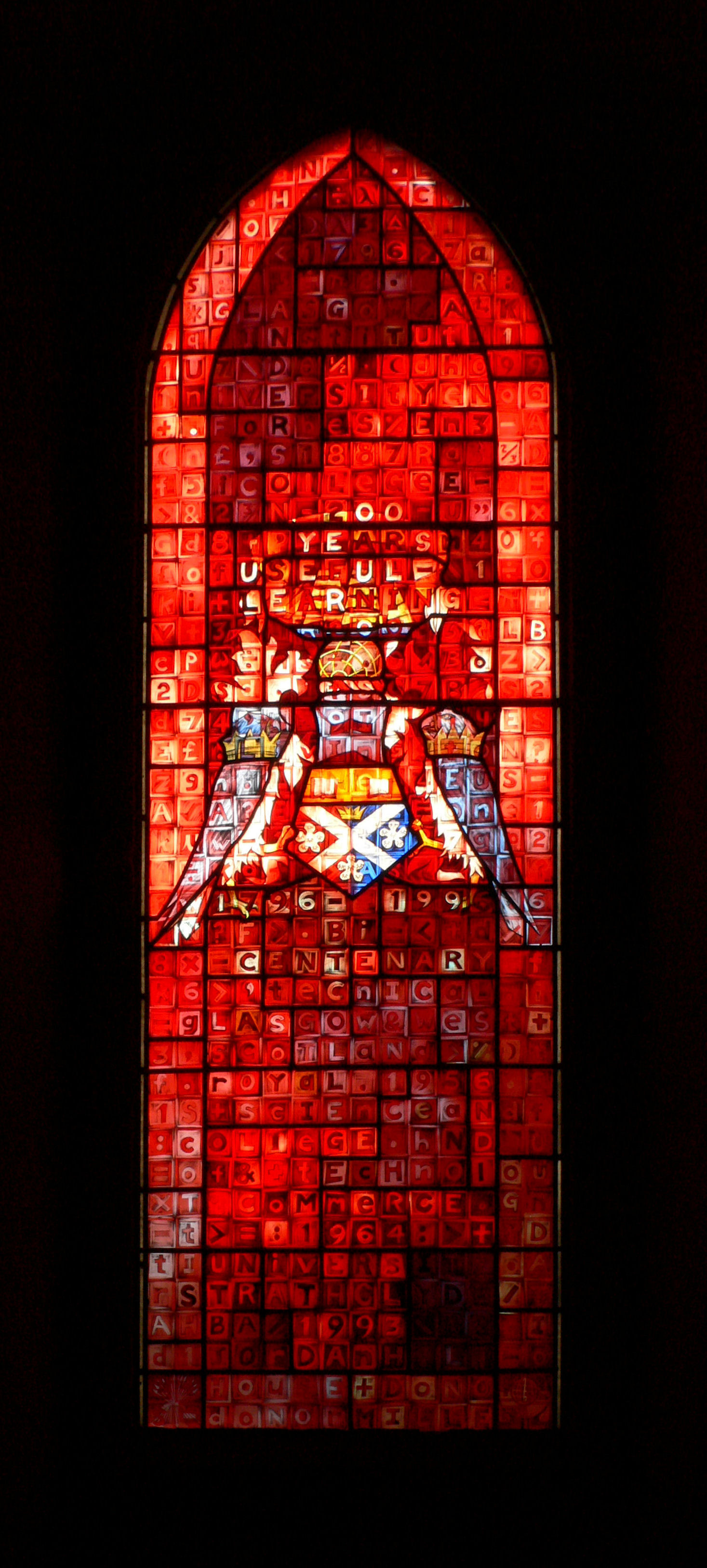 …The windows will celebrate 200 years of the educational achievement over the period 1796 - 1996. The starting point is John Anderson, the founder. In January 1996 the University will be granted supporters to its crest by the Lord Lyon Court and the new crest or coat of arms will be the Bicentenary logo.