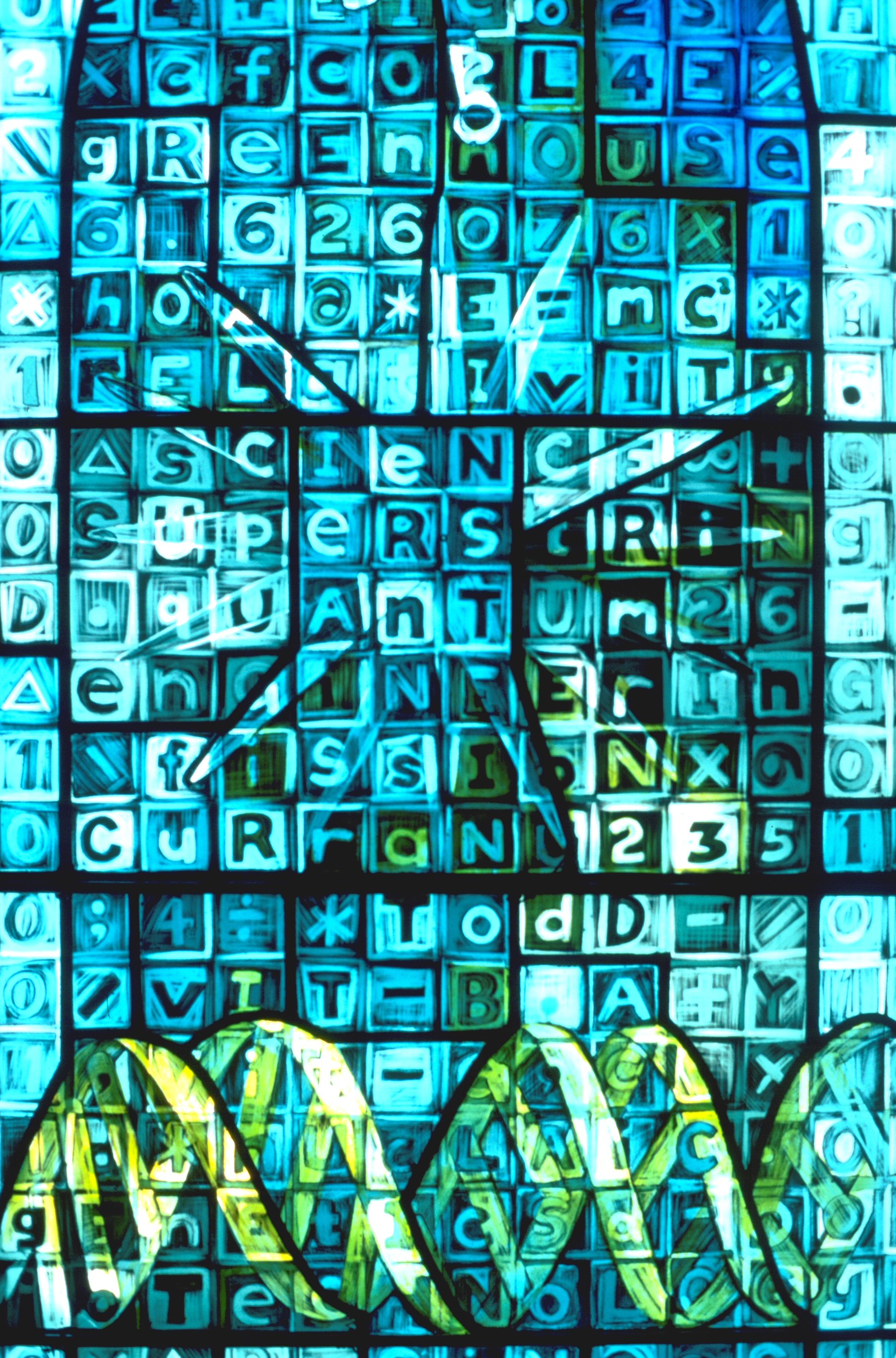 In the upper part of the window is the date 1796. The name Anderson runs vertically with the other names of: Glasgow, Institution, Forbes, University and collage crossing through it. The name Atheneaum runs also vertically in this area.