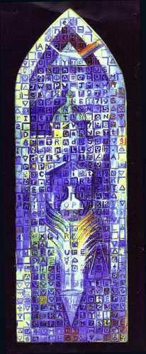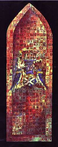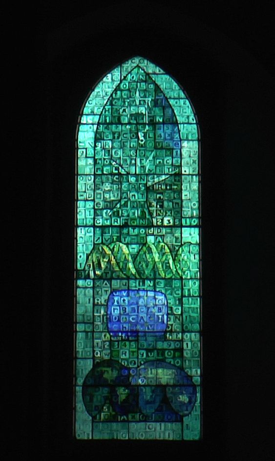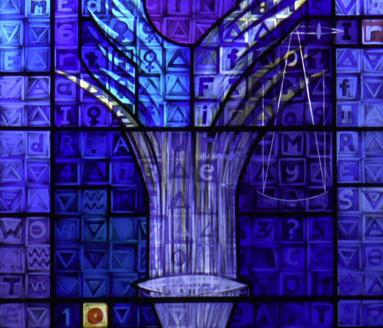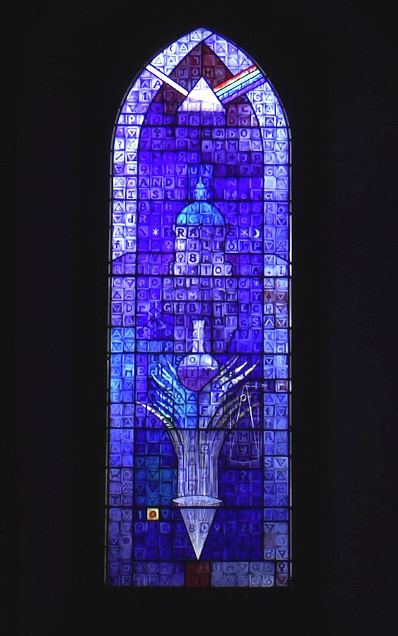 These symbols are used extensively throughout this window and particularly in the border. There are also the early symbols for the planets and for male and female in roughly equal quantities.