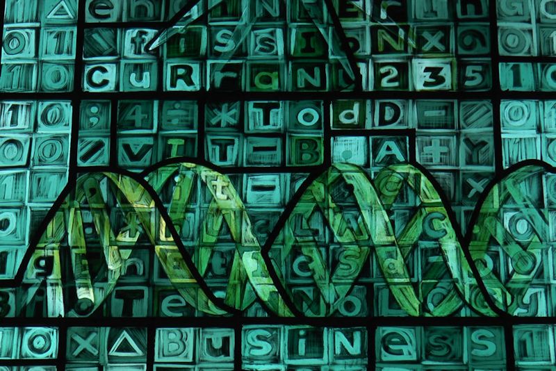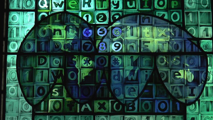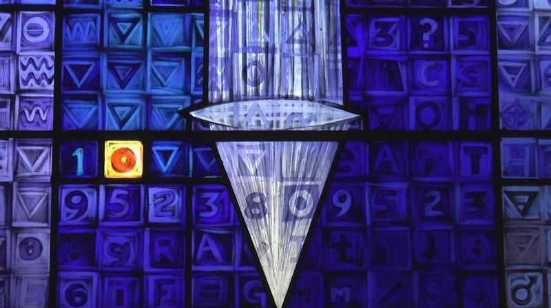 At the base the majority of the squares are filled with 0 and 1, the binary system representing all things digital, the first line, QWERTY of a typewriter or computer keyboard and the f1, f2, f3, etc. function keys,