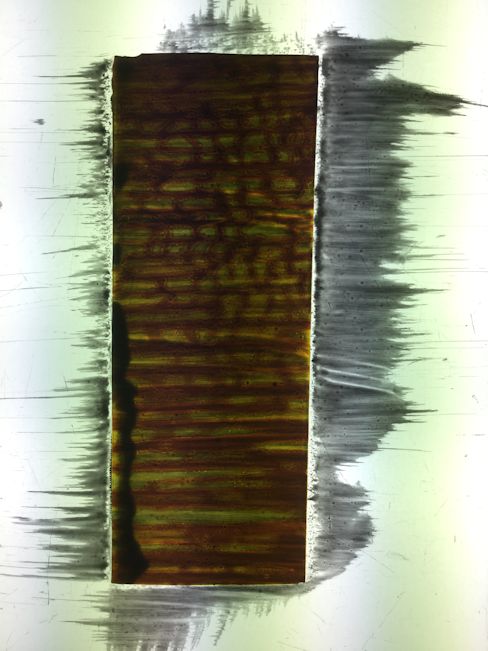 The most important technique employed here is acid etching. The mouth blown, lamberts flashed glass, is protected on the back and repeatedly etched on the flashed side. This technique alone can be very beautiful, but I wanted to add another layer of quality. This was done using glass painting. Just as I developed etching techniques for this kind of work, I developed a method of glasspainting that is also subtle and very appropriate.