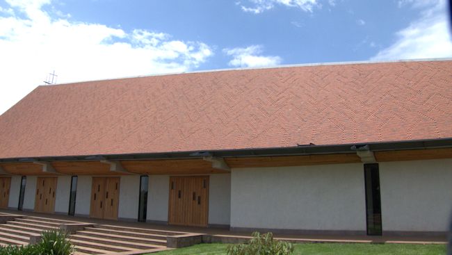 The roof for the cathedral has this outer layer of terra-cotta tiles from Kenya Clay. It was felt that the tiles should not be left simply in this natural state, so we created a design based on cutting the tiles.